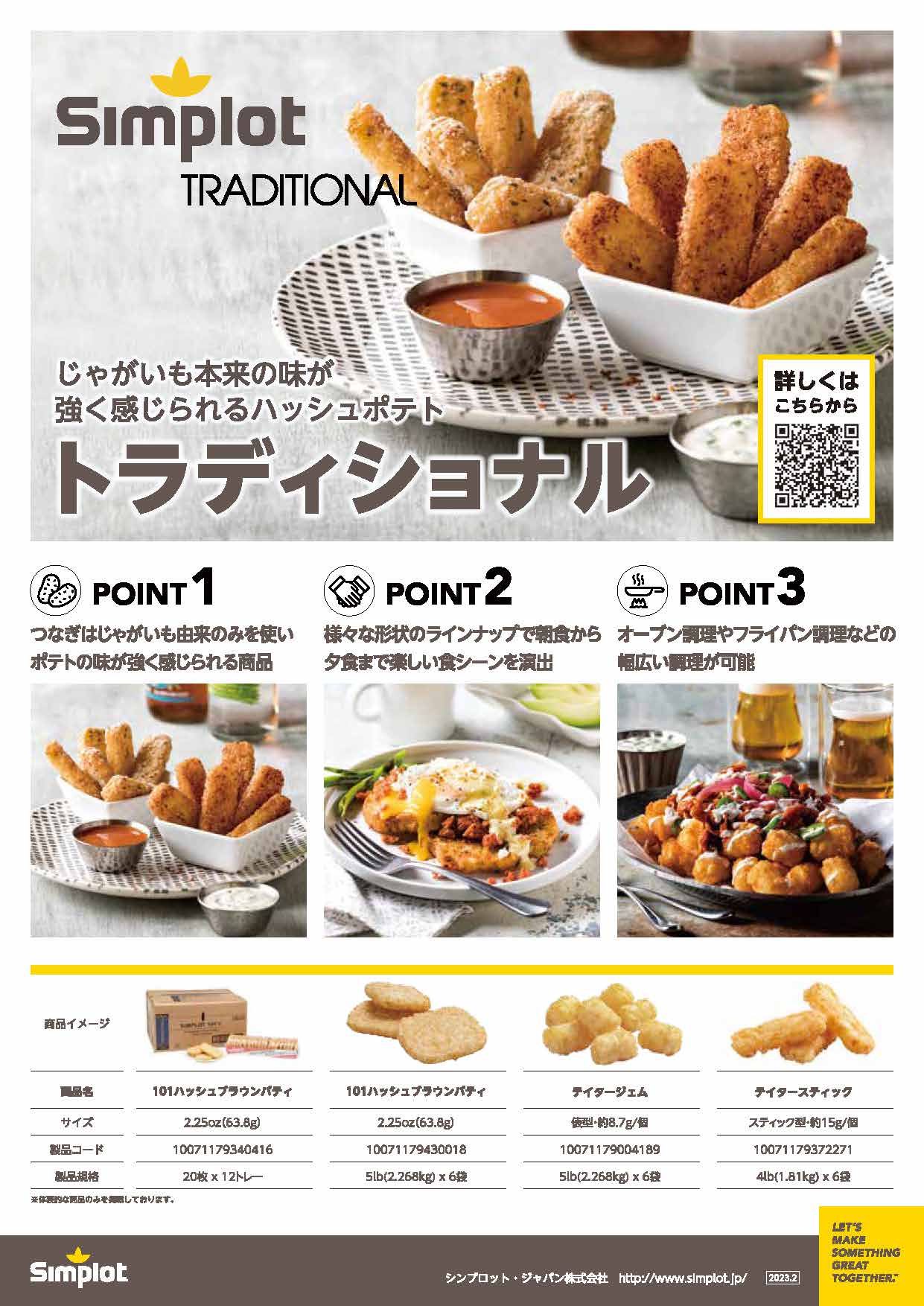 「Tater Squares」は、独自のスクエア形状とカリッとした食感、しっかりした味付けが魅力の新しい ポテトアイテムです。約90秒というスピーディーな調理時間で、ピーク帯のオペレーションを強力にサポートします。どんなメニューにも使いやすく、プレートに華やかさと付加価値をプラスします。